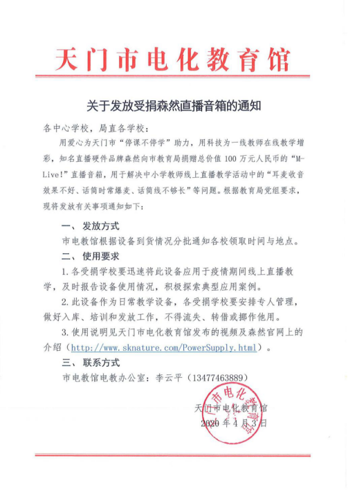 3月20日,深圳市超越自然多(duō)媒體(tǐ)有(yǒu)限公(gōng)司向湖(hú)北天门市教育局捐赠了1000台“森然M-Live !”直播音箱(价值100万元)在線(xiàn)教學(xué)设备,為(wèi)保障中(zhōng)小(xiǎo)學(xué)生疫情防控期间“停课不停學(xué)”提供支持。目前该在線(xiàn)教學(xué)设备已成功送达湖(hú)北天门市教育局。4月3日,天门市電(diàn)化教育馆发布了《关于发放受捐森然直播音箱的通知》,各中(zhōng)心學(xué)校、局直各學(xué)校按通知领取设备,并迅速应用(yòng)于疫情期间線(xiàn)上直播教學(xué)。